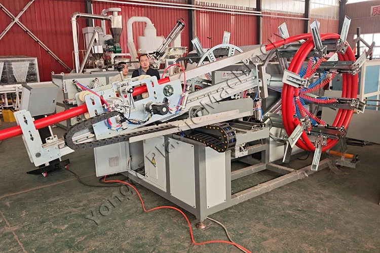 2025 年、当社はカスタマイズされた 2 セットの自動 PE パイプ巻線機をアルゼンチンの大手プラスチック加工企業に納入することに成功しました。クライアントは、新しく拡張された高速 PE パイプ押出ラインに適合する高効率の巻線ソリューションを必要としていました。注文は 2 つの特殊なユニットで構成されています。1 つは直径 15 ~ 32 mm のパイプ用に最適化されたダブルステーション自動巻線機、もう 1 つは直径 20 ~ 63 mm 用に設計された大容量モデルです。これらの機械は高速 PE パイプ押出ラインとシームレスに統合され、パイプを均一なロールに自動的に巻き取ります。自動長さカウントシステムが装備されており、目標の長さに達すると、機械は自動切断とステーション移動をトリガーします。完成したロールを固定すると同時に梱包用のアラームを作動させ、完全に自動化された巻き取りソリューションを提供します。出荷前の厳格な工場テストにより、納品後の現場での安定した動作が保証されます。