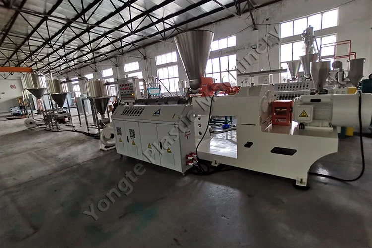 2024 年、当社はポーランドのクライアント向けに、リサイクル PVC と CaCO₃ フィラーから PVC マスターバッチ顆粒を製造するように特別に設計されたカスタム PVC コンパウンドペレット化機を設計しました。 CaCO₃ フィラー含有量は、お客様の製造仕様に合わせて 40% ~ 80% の間で柔軟に調整できます。主要なコンポーネントには、自動フィーダー、SJSZ80/156 円錐二軸押出機 (ABB 周波数インバーターを備えた 75kW モーター、安定動作中に約 50KW を消費)、均一な顆粒切断のための高温ペレット化ダイス、および 304 ステンレス鋼の 3 段階急速空冷および搬送システムが含まれます。この機械は 300 ~ 400 kg/時の生産能力を実現し、ダウンタイムなしで 24 時間 365 日連続稼働できるように構築されています。エンドツーエンドのサポートを提供する Yongte の専門家チームのサポートにより、インストールはシームレスに完了しました。設置後のオンサイトトレーニングにより、クライアントのスタッフは機器を上手に操作できるようになり、ビデオガイダンスによるリモートテクニカルサポートにより問題が迅速に解決され、中断のない生産と最高のパフォーマンスが維持されました。